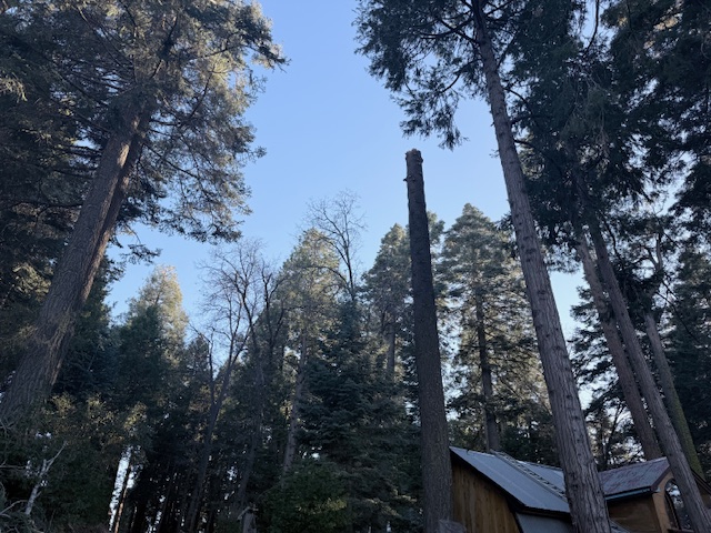 This photo shows a standing dead fir that lost the top 40 feet in one of our recent storms. The wind blew that huge treetop about 30 feet away, blocked the road but thankfully it did not hit the cabin. This tree was on the grant list but needed that equipment that is heading our way so rest of the tree will come down. So thankful for Stan’s work getting this grant for our beautiful mountain!