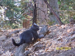 Pete and Holly are almost on their way to North Dakota with their two dogs and up until a couple of hours ago, Holly’s favorite cat of all times, Rosebud. Rosebud had just been let out of his carrier to stretch his legs up at the Round House when he slipped out of his bridle and took off like a bolt of lightning. Rosebud lived for many years at Holly’s “Blue Haven” on Bailey Road so might be around Bailey’s. Or, since it is now well past dinner time, he just may be headed toward their former cabin at the end of Crestline. Pete and Holly will leave the first thing in the morning and would love to take Rosebud with them. However, if he isn’t back in Holly’s arms before they go, they would appreciate hearing any news so please “Comment” or call with sightings of this much-loved Rosebud.