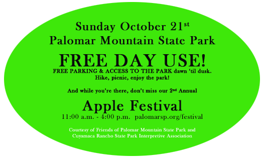 Come enjoy the park at NO CHARGE on Sunday, October 21, dawn ’til dusk – courtesy of Friends of Palomar Mountain State Park — our way of saying “Thanks” to everyone who supports and loves our favorite park.