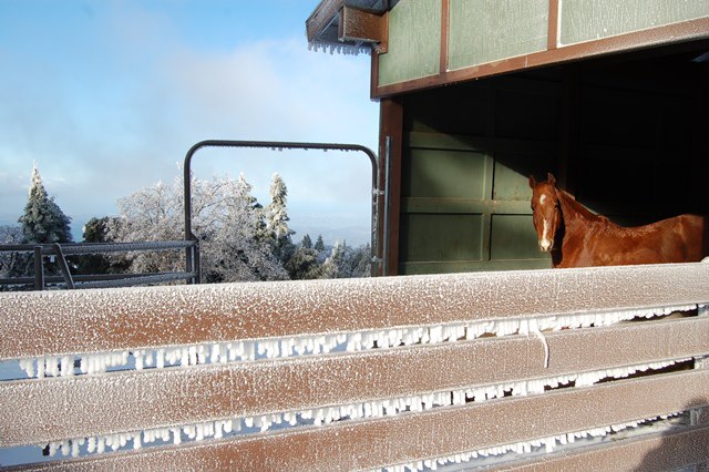 Buddy is lovin’ it that we didn’t get more snow! He thinks his stable is the place to be when we are treated to the white stuff. Of course, I love our Southern California snow and it is even better when shared.