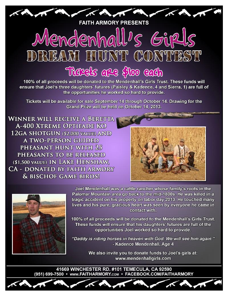 Beginning this Saturday, September 14 during our Grand Opening Event and going until October 14, we will be running the following contest to raise money for the Mendenhall family and, specifically, for Joel Mendenhall’s three daughters, ages 1, 4 and 4, who are his survivors and the focus of this contest. He was a great man and father who lived a good, honest life, and he provided well for his family. His ranch, Mendenhall’s Homegrown Cattle Co., supplies grass-fed, free-range beef to Whole Foods Markets Inc. in San Diego and Orange counties.