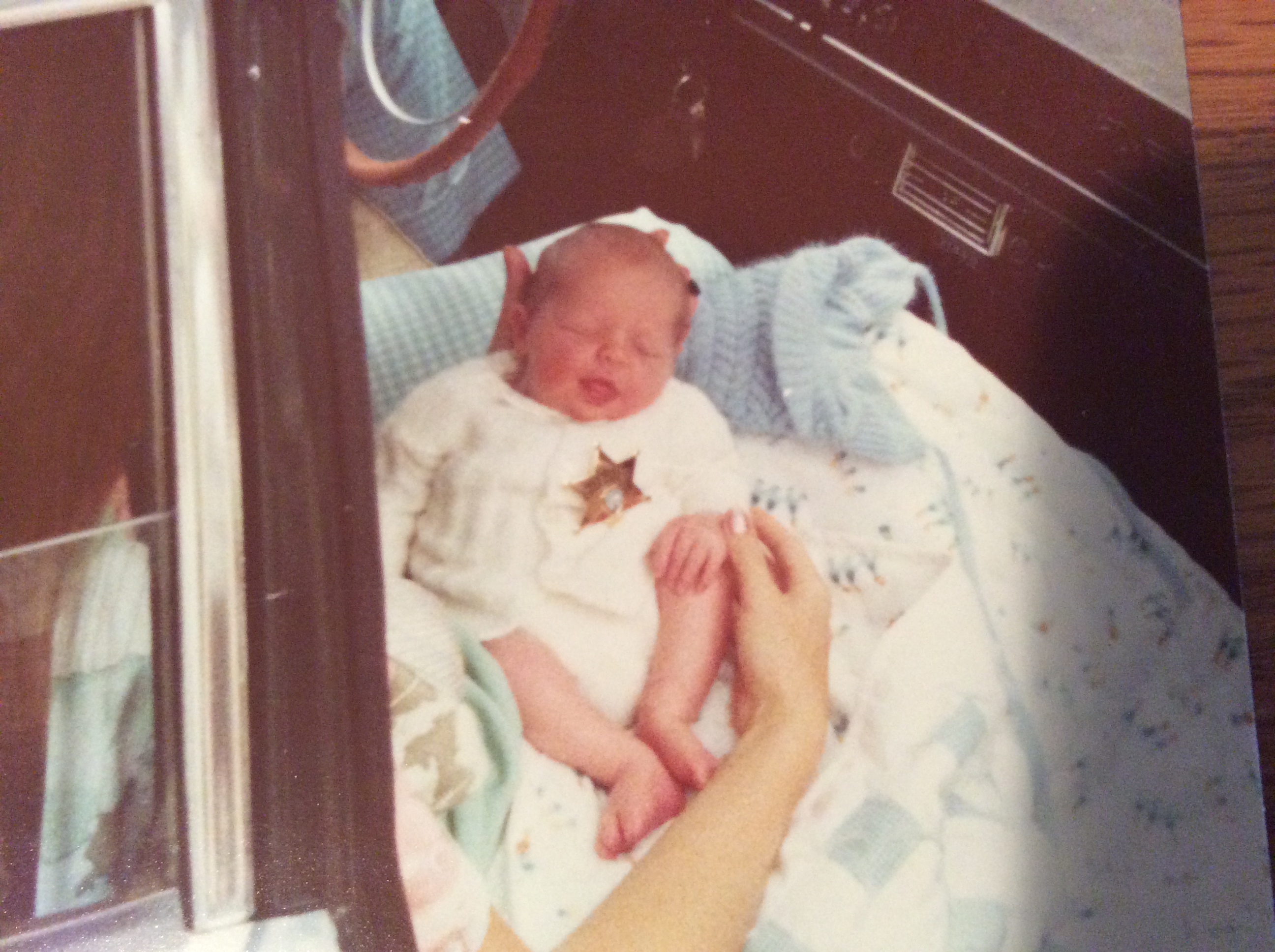 A long, long, time ago, long before seat belts and car seats, our oldest son was born.  The next day was Mother’s Day. Couldn’t ask for a better day to leave the hospital.  I don’t know what I was thinking, I had Brandon in a little sweater set a friend had made, and a snow hat – because we were going home to Palomar  – it might be snowing!  Then I bundled him up in a blue and white quilt my grandma made.  (We left the pink one in the back of the car).  Had him on my lap all the way up the mountain.
