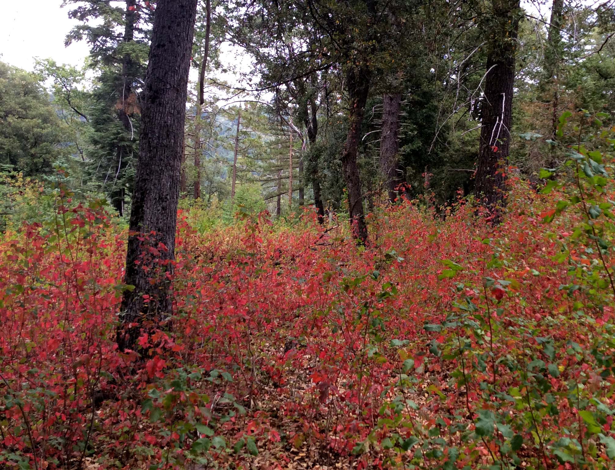 Our vibrant “Fall Colors” are a little early this year!  Had to stop and take this for you, driving through the State Park today.  One Thanksgiving Day we saw a couple parked along side the road with the trunk of their Mercedes wide open.  They were cutting the pretty foliage to decorate their Thanksgiving table.  Thinking those folks were pretty miserable for a couple weeks since it is poison oak.