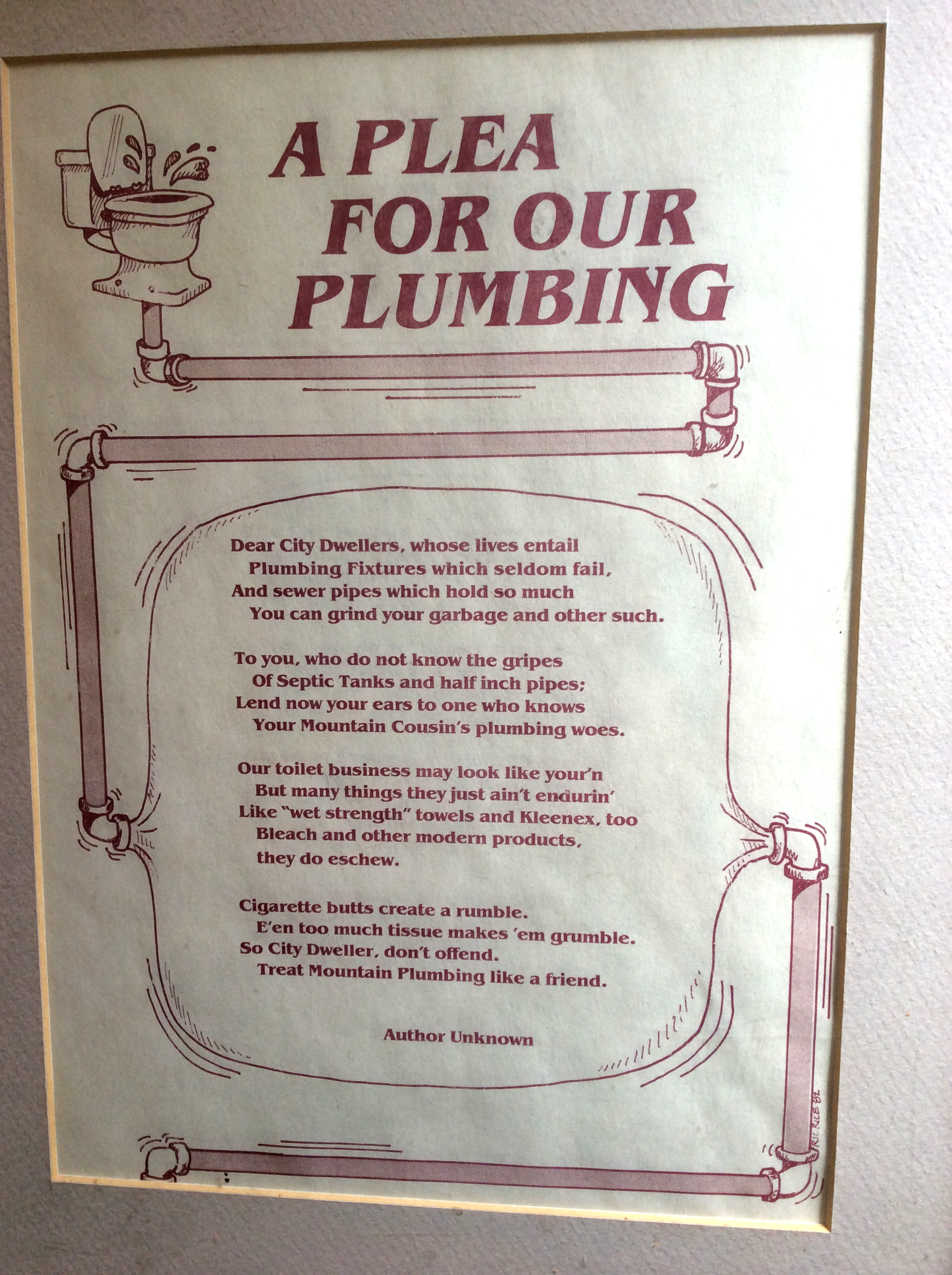 Camping in the High Sierra’s, I came across this poem on the wall of an almost-out-house. The plaque wasn’t for sale, so took the pic for you. Sometimes the mountain septic systems have been a little taxed. I’m thinking a version of this just may show up in some of the Vacation Rentals and cabins on our little mountain. The rentals are non-smoking but have had issues with toys in the commode, (oh my!) so I took a little liberty: