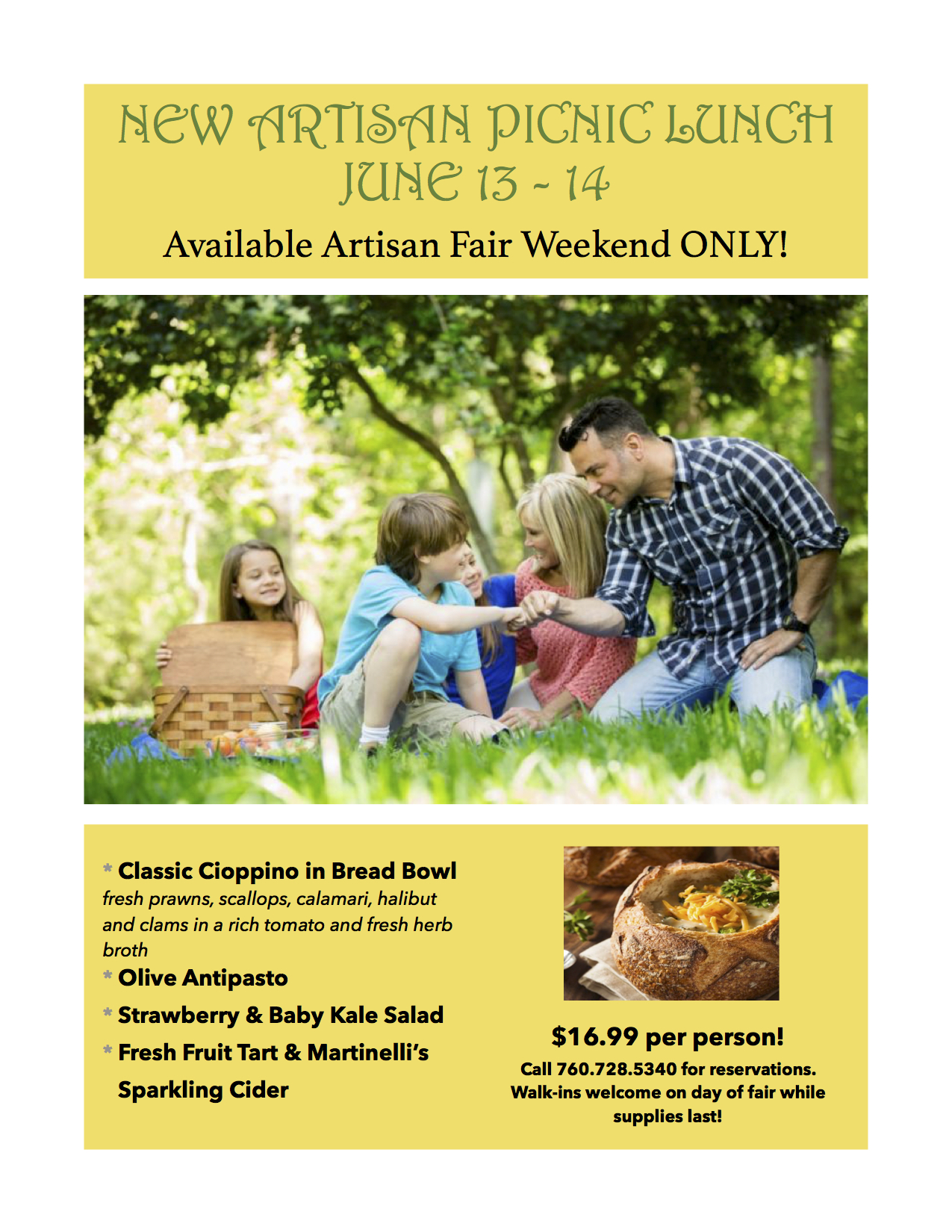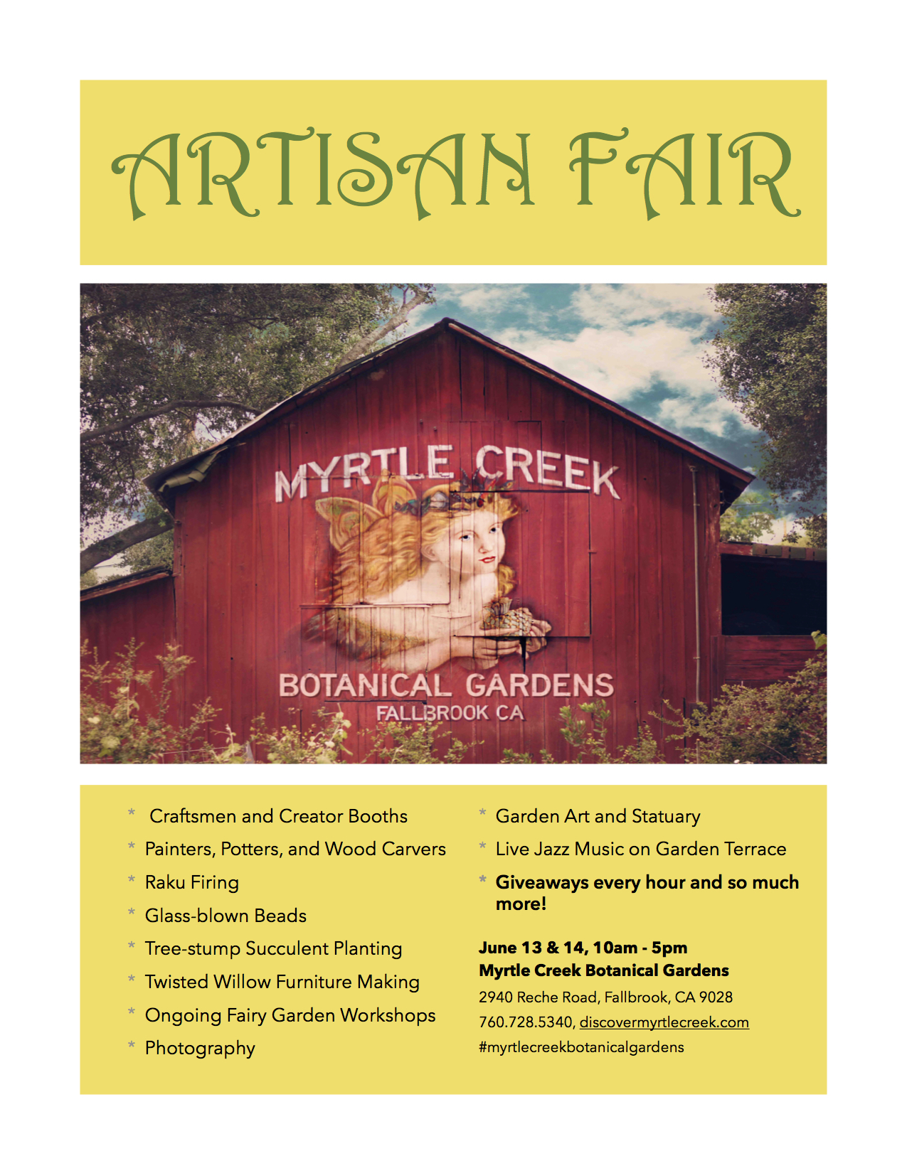 Everyone is invited to this Artisan Fair in Fallbrook this weekend. Just sending the info your way in case you guys want to come or share it. The Art Fair is located at a huge botanical garden and nursery and with Spring in the air, some of you might want to buy plants. This fair is unique because the artists have to be making their craft at their booth. I will be making custom jewelry and Matt will be wood burning and branding into Palomar Woods. They serve farm to table amazing cuisine. Looking forward to meeting some of you friends of Palomar at our booth!
