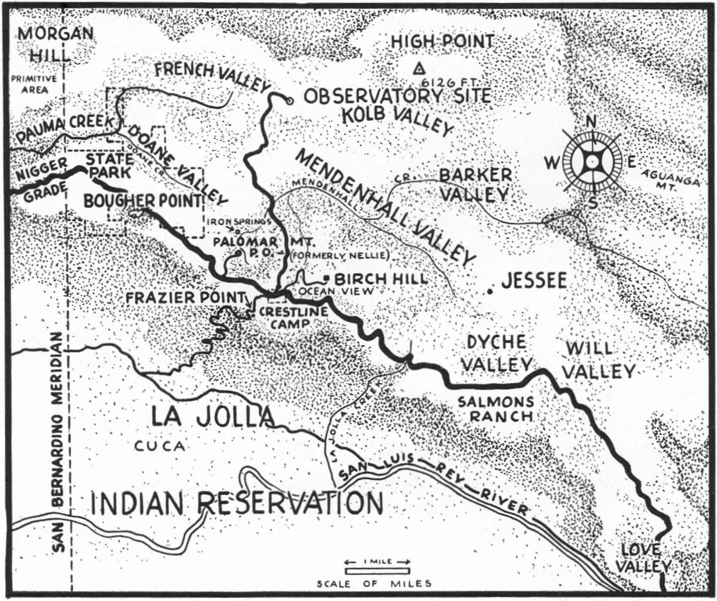 Ocean View Camp appears in a photo on age 91, and on the map in Catherine Wood’s 1937 Palomar history book and is mentioned briefly in a San Diego Union travel piece in 1939. There’s no other mentions of it in the San Diego Union or San Diego Tribune from that era. The dearth of newspaper mentions is noteworthy I think, … I bet it didn’t last too many years. I don’t know the Palomar fire history without research into it, but maybe it got burned out (?) I would peg Ocean View Camp as existing at minimum from before Wood’s book was published in 1937, and through 1939. The map is not specific as to its location but it seems right around the firestation there.