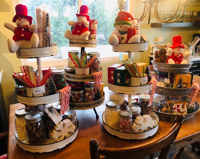 These made-on-the-mountain Hot Chocolate Stands were fun gifts made by one of our favorite neighbors, Teresa McCarthy. She is not taking orders, they aren’t for sale, but she shared the photo as a cute idea for those who might like to do the same thing. Teresa found her finds at Hobby Lobby, Ross and the Dollar Store. I saw a cute set of trays at Valley Thrift – such a deal.
