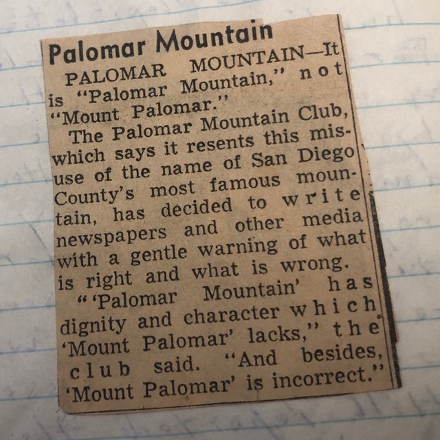 ‘Palomar Mountain’ has dignity and character which ‘Mount Palomar’ lacks, the club said. And besides, ‘Mount Palomar’ is incorrect.