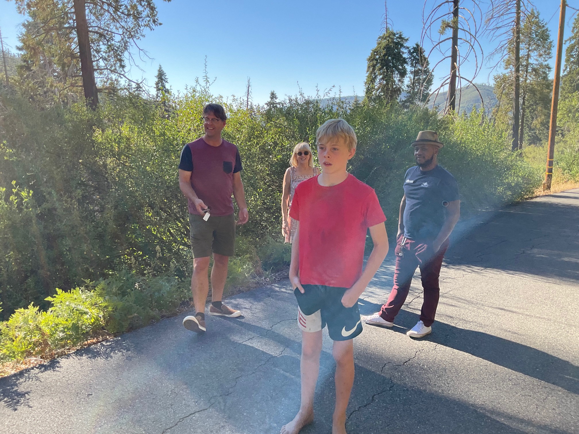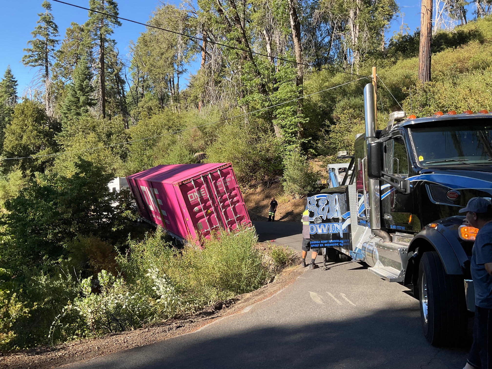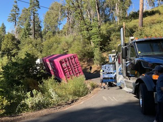 Well, we had an adventure after that wonderful ShowDeo today. At the closing, as the campers were getting ready to say goodbye to their their horses, gather up their luggage and go home, we learned the road was blocked. An 18 wheeler got lost (on his way to Pauma Valley). He got a little close to the edge and blocked the road to get out, right by the dogwood trees. A huge tow truck arrived pretty quick and it was remarkable how fast the road was open again.