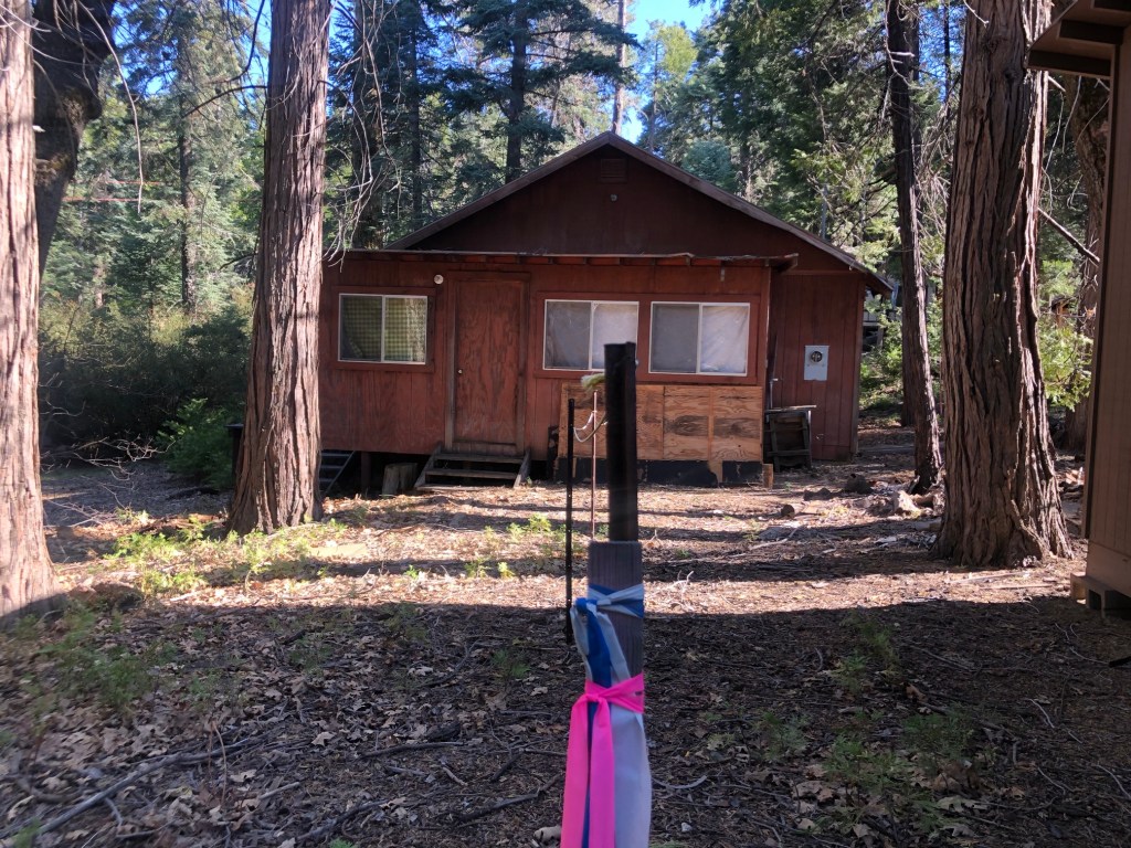 Oh! There are a few more features you might appreciate knowledge of prior to coming up to Palomar Mountain to see this gem. Recent recorded surveys show the westerly property line goes right through the cabin (Ah ha! That is what the pink ribbon in the photo is all about). About 50% of the cabin really, truly is on the neighbor’s land. He doesn’t have a appetite for an easement or boundary adjustment so the cabin will need to be moved off his land. The shed on the other side of the property line is yours, too. Just needs to be moved. Imagine that!