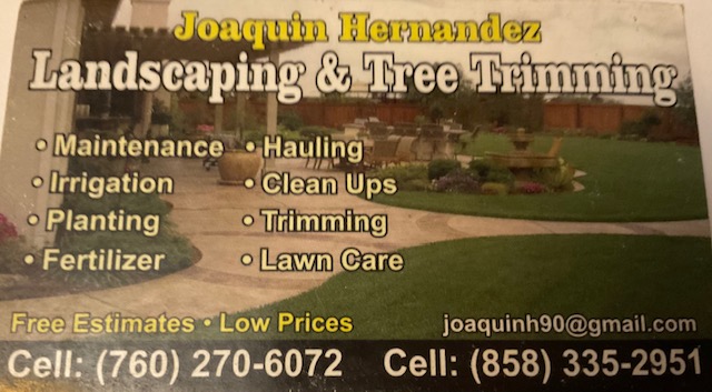 Found: Exceptionally good, much needed, weed wackers and property clean up crew with Hugo and Joaquin. Joaquin came highly recommended by quite a few north county folks and was willing to come to Palomar. We had them up all week with up to 5 guys in one day working on about 25 acres. What a transformation. It was so inspiring to see their work ethic. Hugo is an amazing ‘singing machine’ up and down the properties with a weedeater. Yes, singing as he is working so very hard and always with a smile.