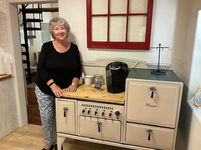 When I opened the door to “her” cabin, Alicelynn was so thrilled to see the Wedgewood kitchen stove is still a part of the decor. She remembers her mother cooking at that stove in their home where she grew up in South Gate. Alas, the city later decided there were to be no more incinerators or wood burning stoves, so Alicelynn and her husband brought it up to the cabin and used it there for many years. It now serves as a very cute Coffee Station.