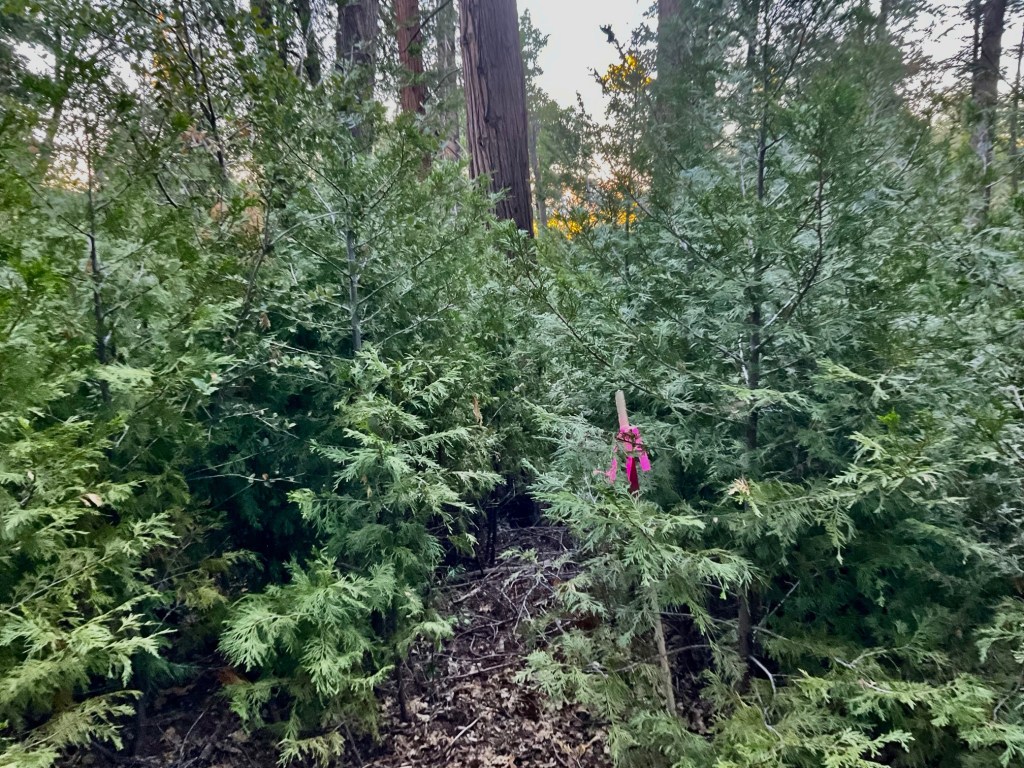 The owners and I drove as close as we could, then started following the little blue dot on my ipad, way down the steep canyons and back up again, over logs, past the deer, under hangers and finally got to where the corner was to be. That little blue dot stopped us right in front of a tall survey stake in the middle of no where! Amazing!
