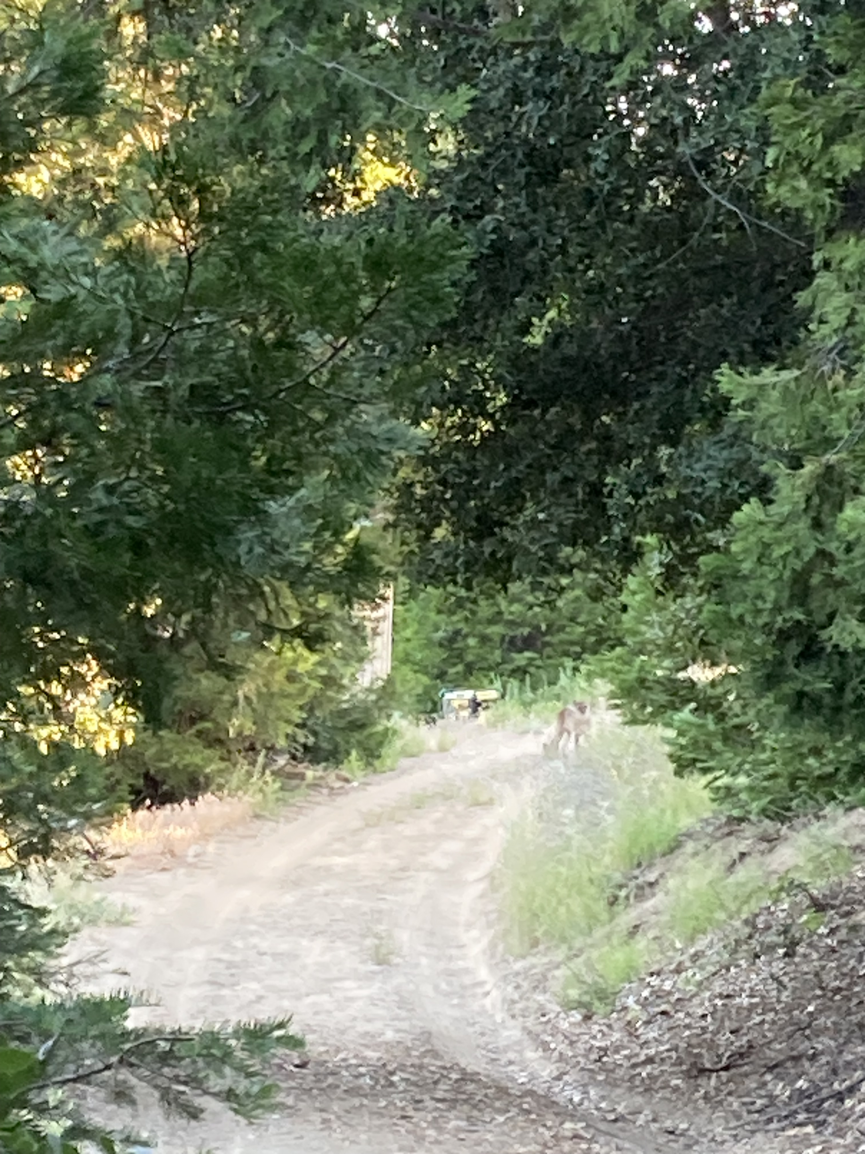 | From: Robert Dowell Yesterday, my dog Siggy and I were walking along the main path on my land, which is 36 acres of old growth forest at the top of Palomar Mountain, when I happened to see a mountain lion just after 7 pm walking directly towards us in the middle of the same path. This was just after I saw a deer grazing in an adjacent open pasture to my left and took a picture of it, so my cell phone happened to be out and still in camera mode. The mountain lion and I stopped at the same time, facing each other, and I told Siggy to stay and spoke to her in a loud and intense voice so that she would look (and keep looking) in my direction and sit still, while also scaring the mountain lion away. Siggy was between me and the mountain lion, but facing my direction, so she never saw it, but it saw us – which is clear from the pictures. I kept Siggy looking my way because she probably would have chased the mountain lion had she seen it, as she always does for squirrels, birds and deer. And she is so intense every time she does this! Once the mountain lion and I were stopped and facing each other, I managed to get a few quick pictures of it (and Siggy, who was still facing me) before it turned and ran up the hill (it blinked first, hahaha), toward where my mountain car was parked. Then I went the opposite way and had Siggy walk with me, keeping her close, while pulling my horn and pepper spray from their holsters on my belt, and removing their safety features. For now, I kept my knife in its holster which, along with the horn and pepper spray, is always on my belt when I walk the land in case Siggy and/or I are ever attacked by a mountain lion. The difficulty was that I didn’t want to keep walking the land in case the mountain lion decided to stalk and attack us, but it had turned and gone up the hill toward where my mountain car was parked. So we walked up the hill to the car and I blew the horn once while talking loudly to Siggy in an attempt to not surprise or startle the mountain lion. Just as we got to my car, Siggy suddenly chased something for about 200 feet until I was able to call her back. It might have been the mountain lion, but I didn’t see what she had chased into the trees. What a wonderful experience, seeing a mountain lion in the wild for the first time, and on my own land – something I had been hoping for since moving up here a few years ago. And while it looks somewhat like a ghost in the cell phone pictures, I could see the mountain lion with my own eyes just as clearly as I could see my own dog Siggy. A little earlier on the same day, Siggy and I were surprised by a large great horned owl on the floor of the forest that was right near us, and it flew away with such a large wingspan. We walked around the land until we found it again on the branch of a tree enjoying the sunshine. What a magical land. |