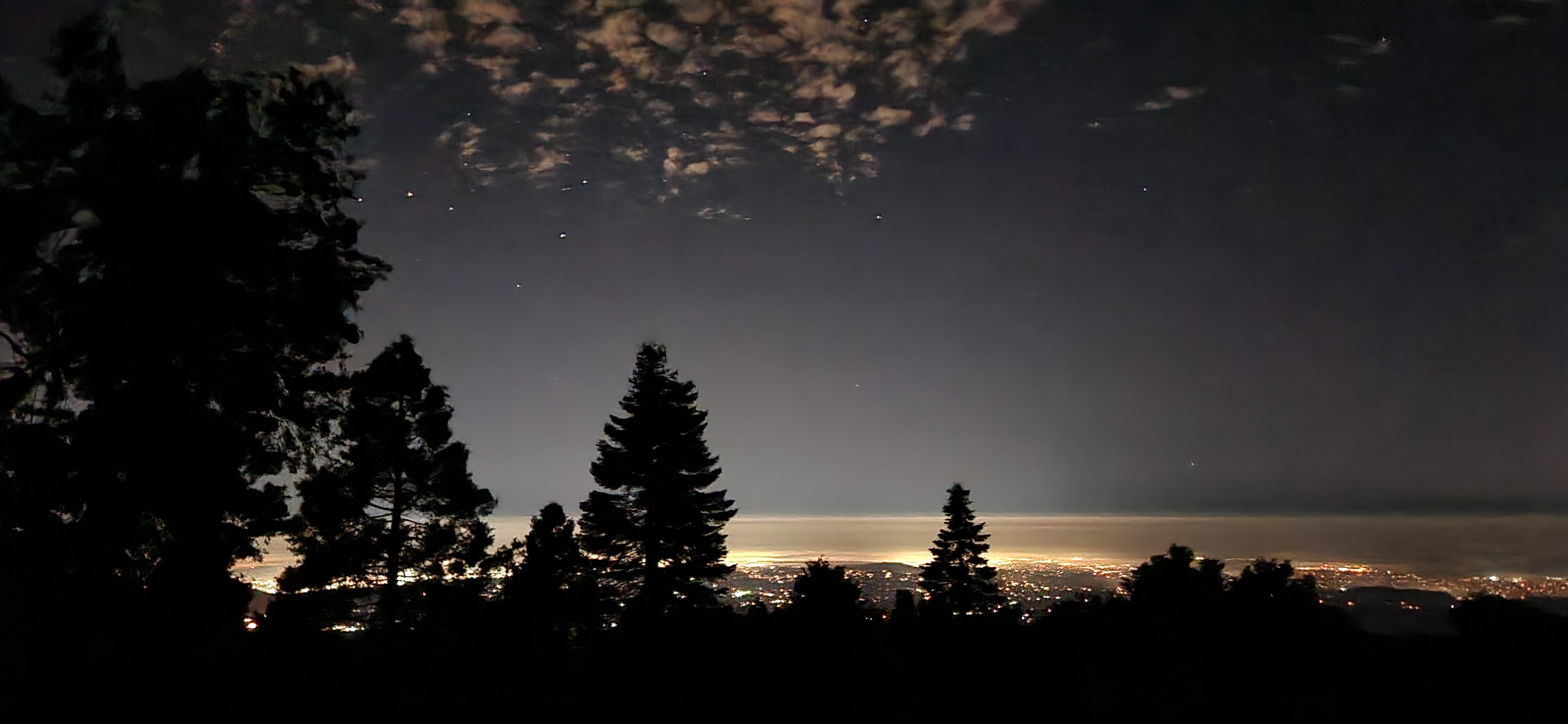 The Highway to the Stars brought a lot of folks up to see the meteor shower from our normally clear sky. Dotted with some scattered clouds, a last minute idea took us to Round House Ranch with the perfect setting to watch the show. Thought you might enjoy the view from the deck looking southwest off the mountain. The marine layer hid the majority of the city lights of Escondido, Valley Center and out to the coast.