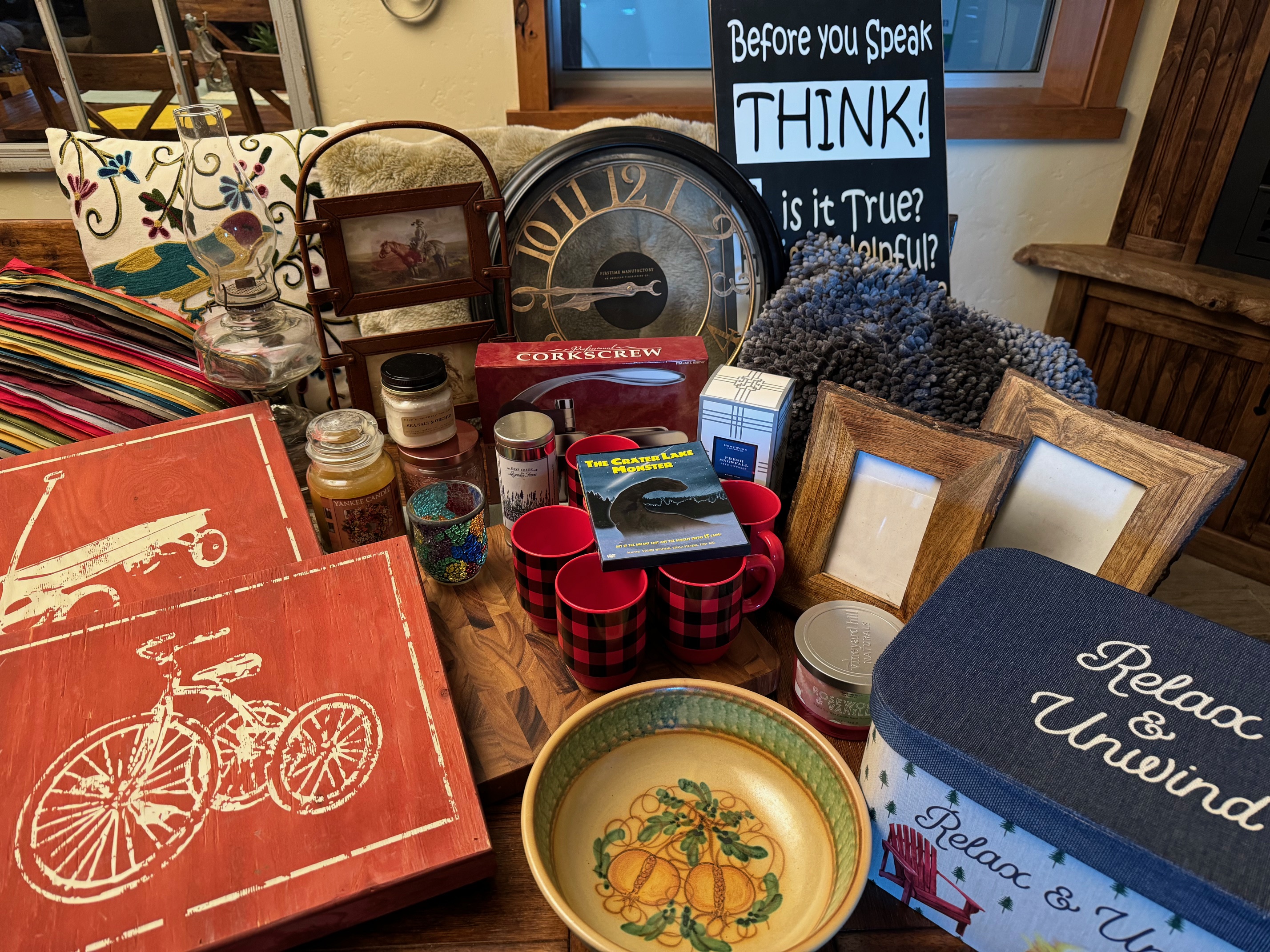 What ideas do you have to donate for the Silent Auction? Here is a peek at a few things that have already come in. They’ve been delivered to the Community Center and Cecelia and Christine will make them into fun displays of irresistible items for your home, cabin or gifting pleasure.