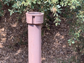 See the photos showing a pipe with no cover? That happens to be the vent pipe above a bathroom on a vintage cabin. Those darn woodpeckers, thinking they are storing up food for the winter, have filled that open pipe with acorns. Their cousins and ancestors for many decades have done all that gathering and stashing for naught. Hundreds – oh, I’m guessing maybe thousands of acorns have found their way into the septic tank. They may even be the cause of the outlet tee and possibly the leach field needing replacing.