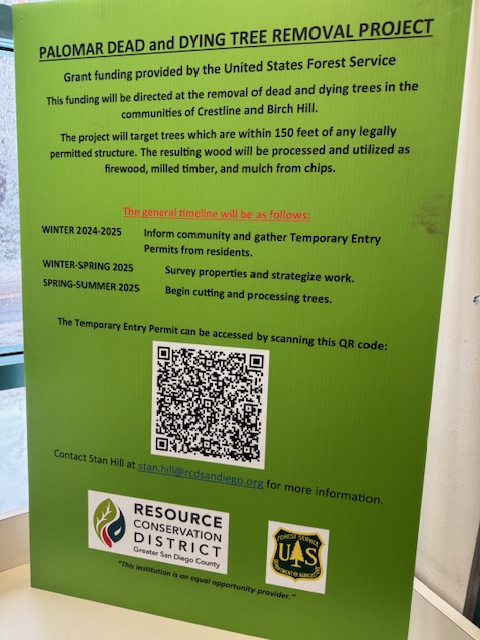 Do you have a home or cabin in the Crestline or Birch Hill area? This poster at the PO tells a little of the grant that is planned to cover more neighborhoods in the future to help make Palomar more fire safe.