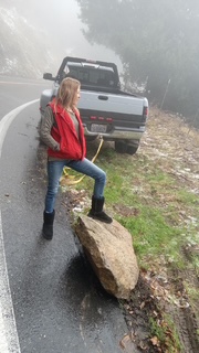 Every storm brings boulders and rocks down on the Grades. The county crews are out 24 hours to keep the roads clear. Over the years when lanes are blocked, I’ve seen other neighbors pull over and do what they can when they can. It is all much appreciated. I do have to give a big shout out to Nick and Janice Ricchiuti who were on their way up for brunch today. They saw this boulder in the road, had a strong tow strap and safely get that boulder and a few smaller rocks out of the road pretty quick.