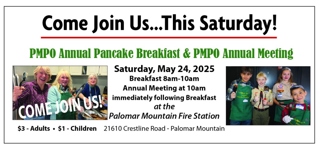 Hope to see you at the delicious breakfast and then the Annual Meeting of the Palomar Mountain Planning Organization. Hot coffee, orange juice, pancakes, sausage, strawberries and YOU! Always a fun time on the mountain.