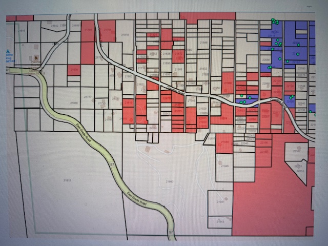 Updated maps from Stan Hill. Today I have been making calls and several more property owners are signed up. The parcels in purple have been surveyed with the green dots showing the trees marked. Properties in red have the surveyors heading their way real soon. The properties in white have not signed up yet. Driving around there are quite a few properties that could really benefit from this free grant.