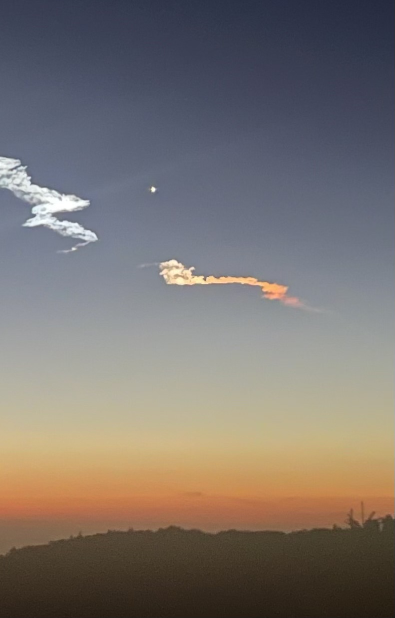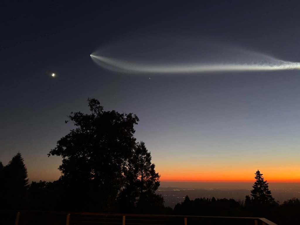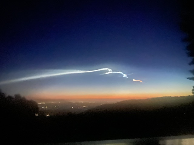Jim and Teresa McCarthy were at their Crestline Cabin. He came up the stairs and said to Teresa, “Oh, look outside!” She captured their shots of SpaceX Falcon 9 with the little dot being the planet of Venus.