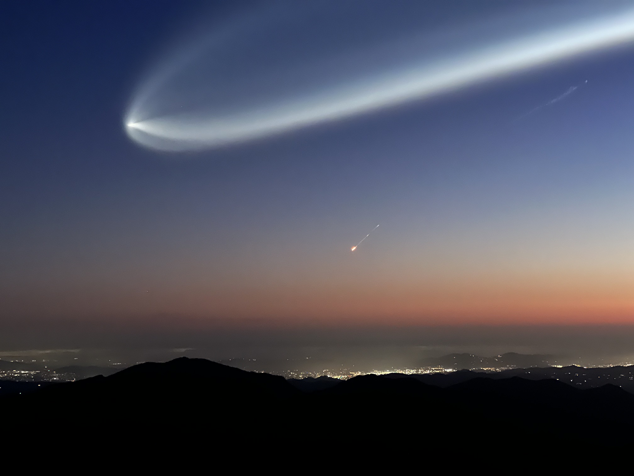 Like a front row seat for the next SpaceX launch? Come on up to one of the lookouts on Palomar Mountain. Mike Pique took the first photo from his deck on the East Grade: “The little orange dot below the “jellyfish” is the first-stage booster performing its entry burn before landing on the barge south of San Diego.”